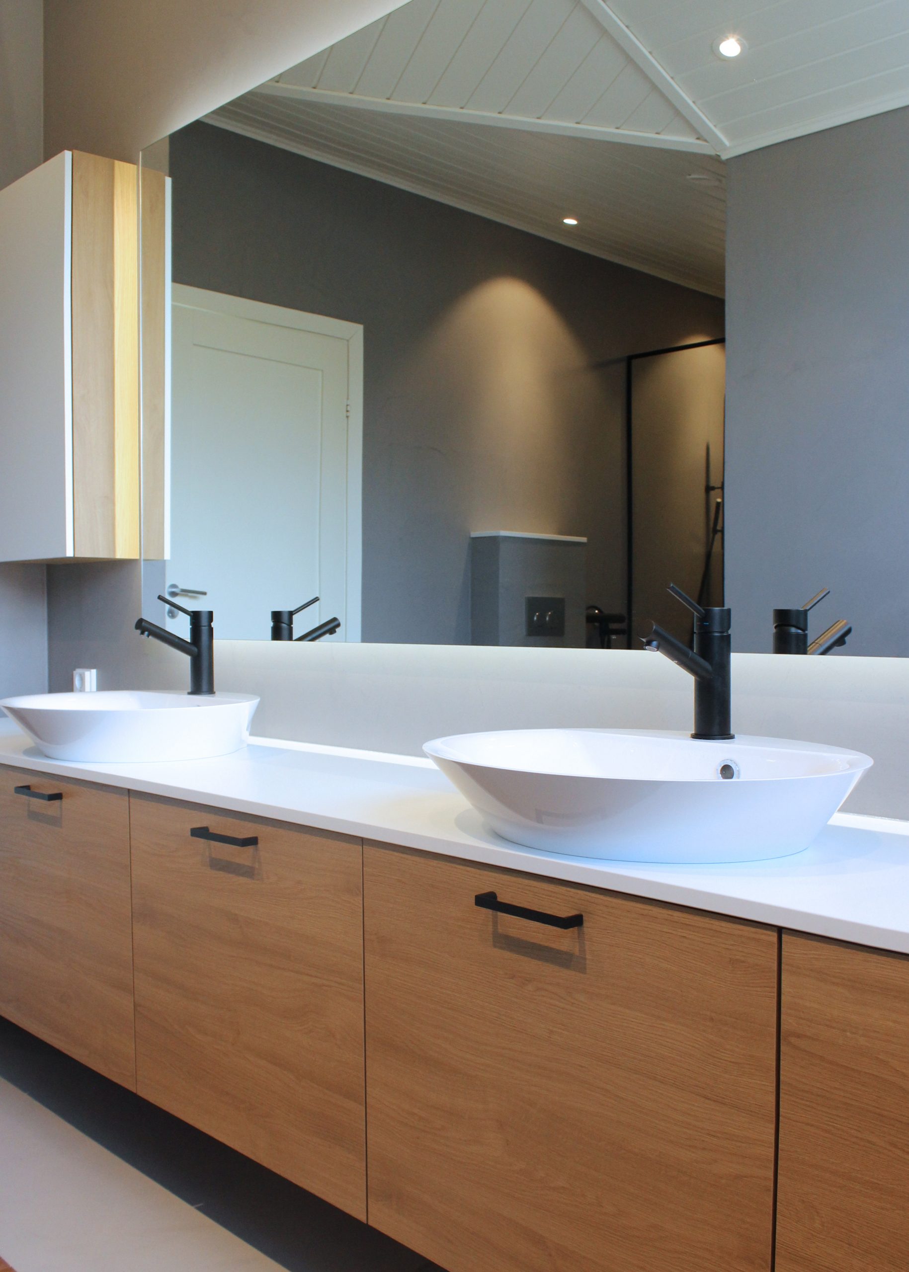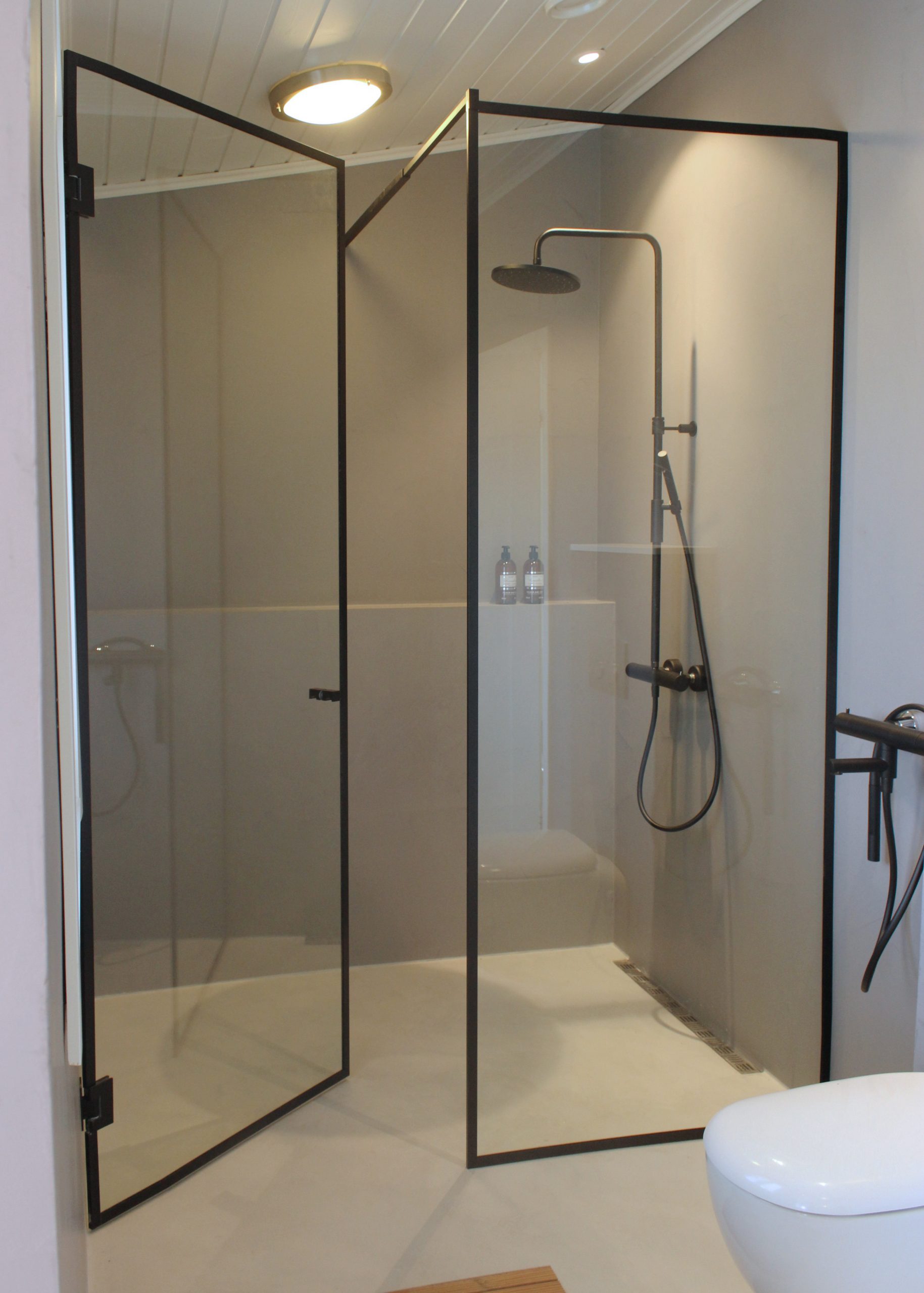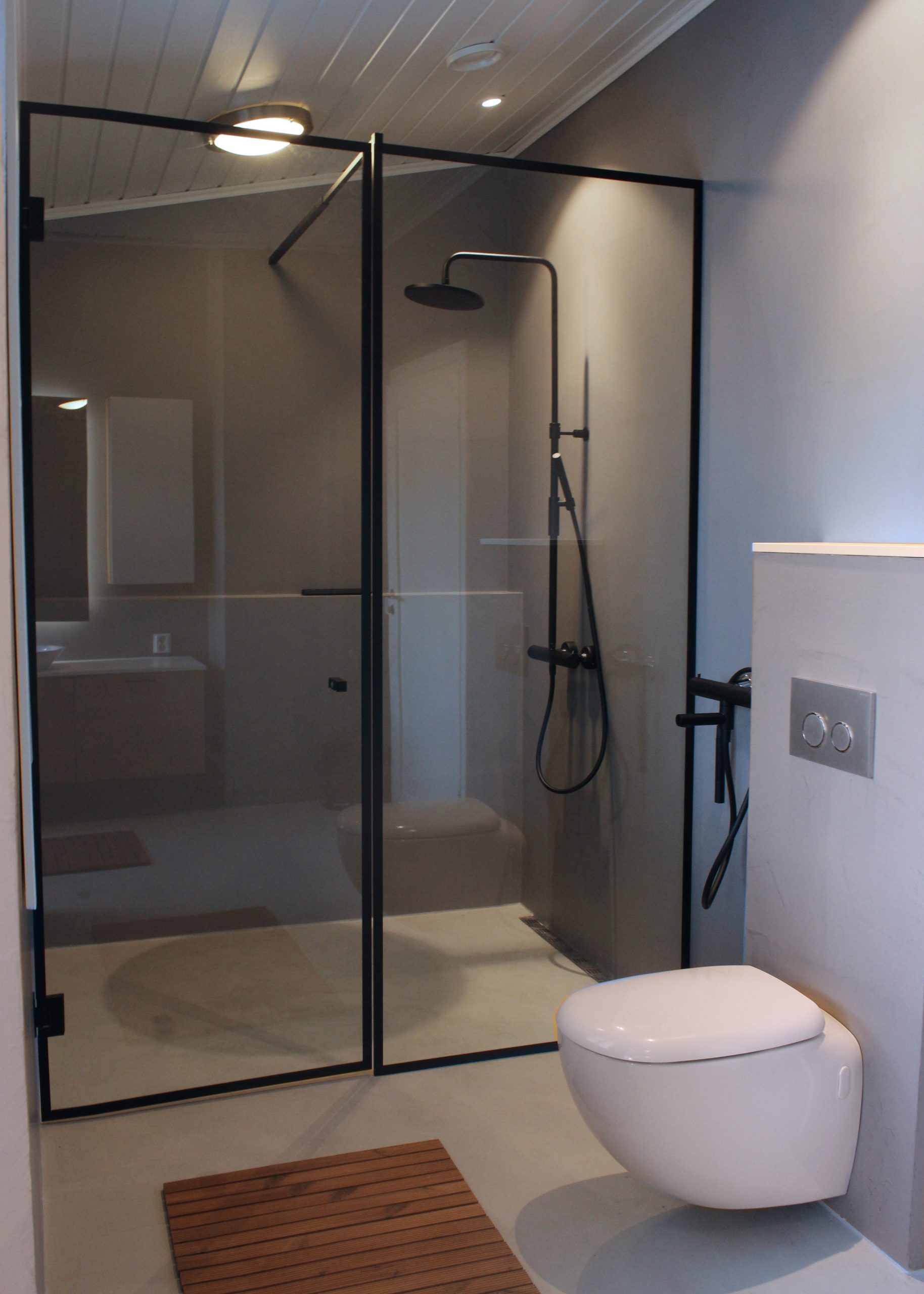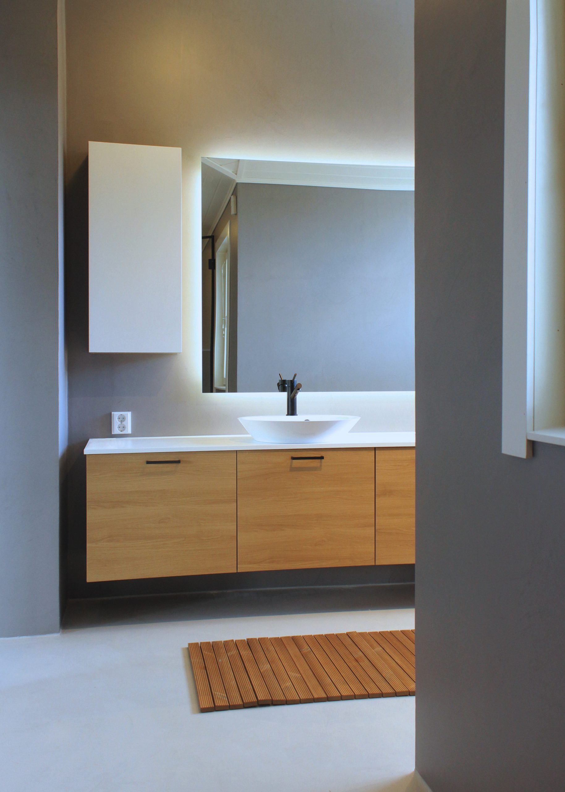 Kylpyhuoneen kokonaisvaltainen suunnittelu; mikrosementtisävyt, kiintokalusteiden suunnittelu, vesikalusteet, suihkun lasiseinän ja peilin suunnittelu